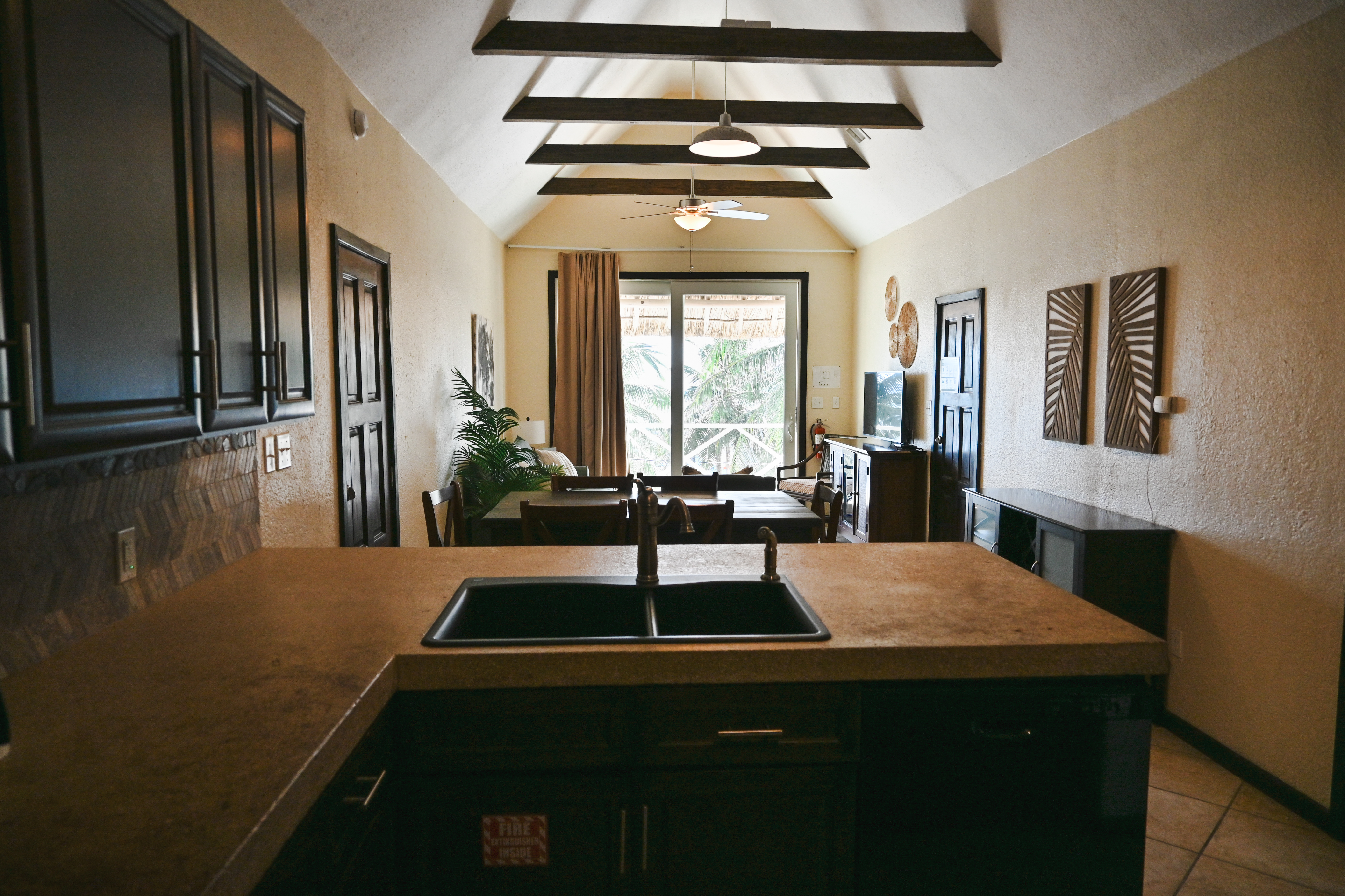 This room has an outdoor covered patio area that overlooks the pool and an unobstructed view of the Caribbean Sea! (Oh, and palm trees....and sand...and a dock...)