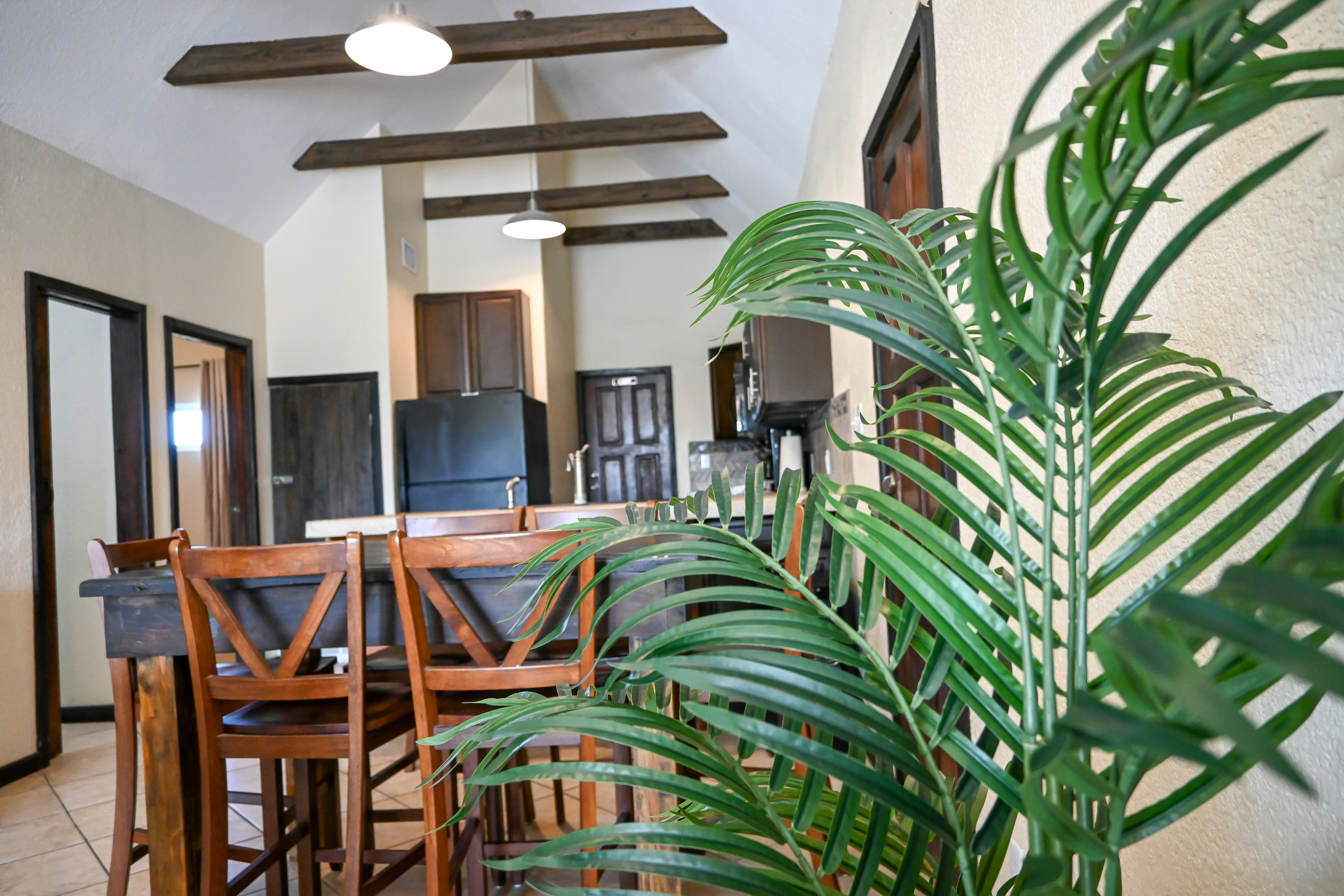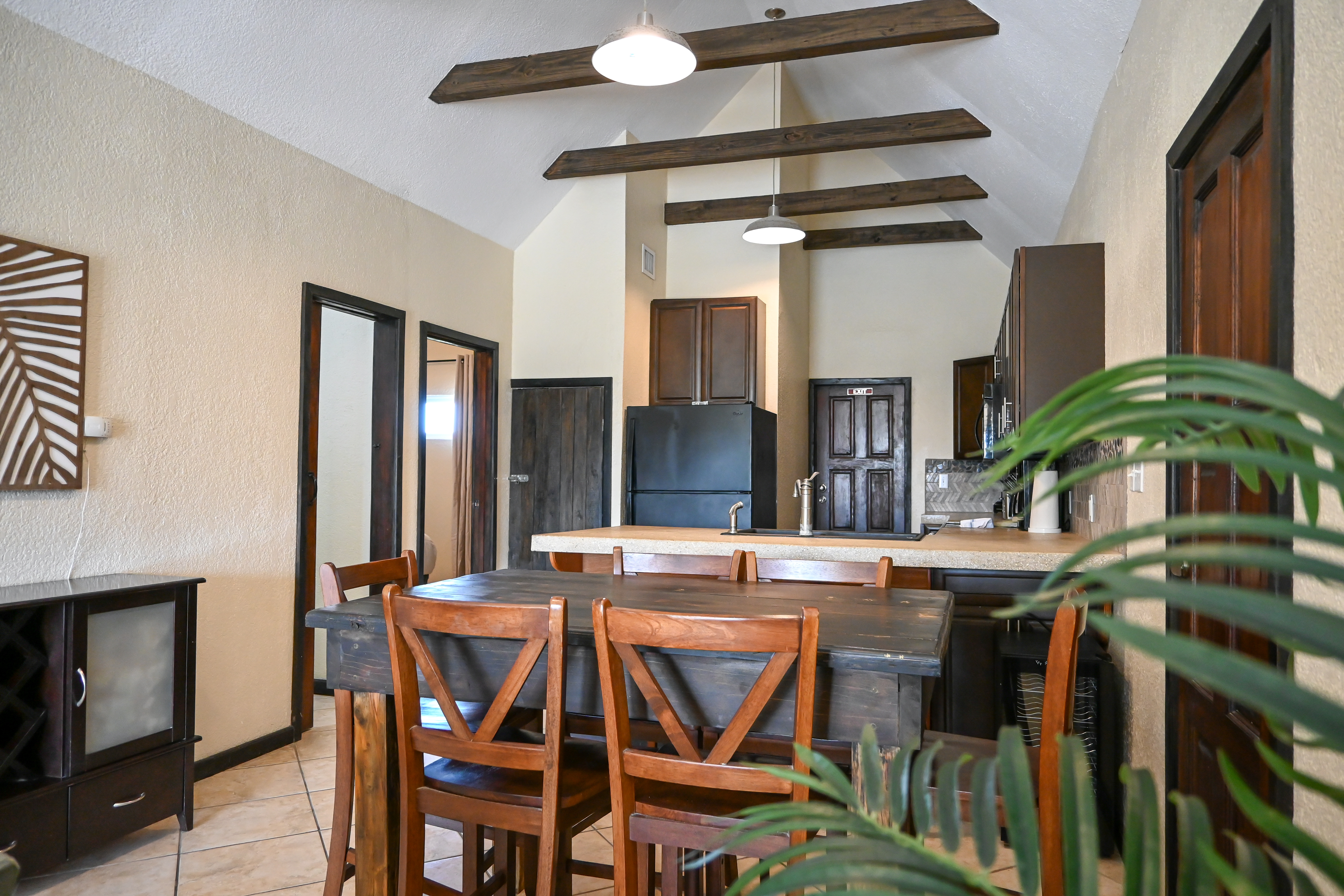There's a full sized dining table, pendant lighting, ceiling fans and vaulted ceilings with exposed beams. Adjoining doors to a queen bed hotel room turn this 1 bedroom/1 bath into a two bedroom/2 bath unit!