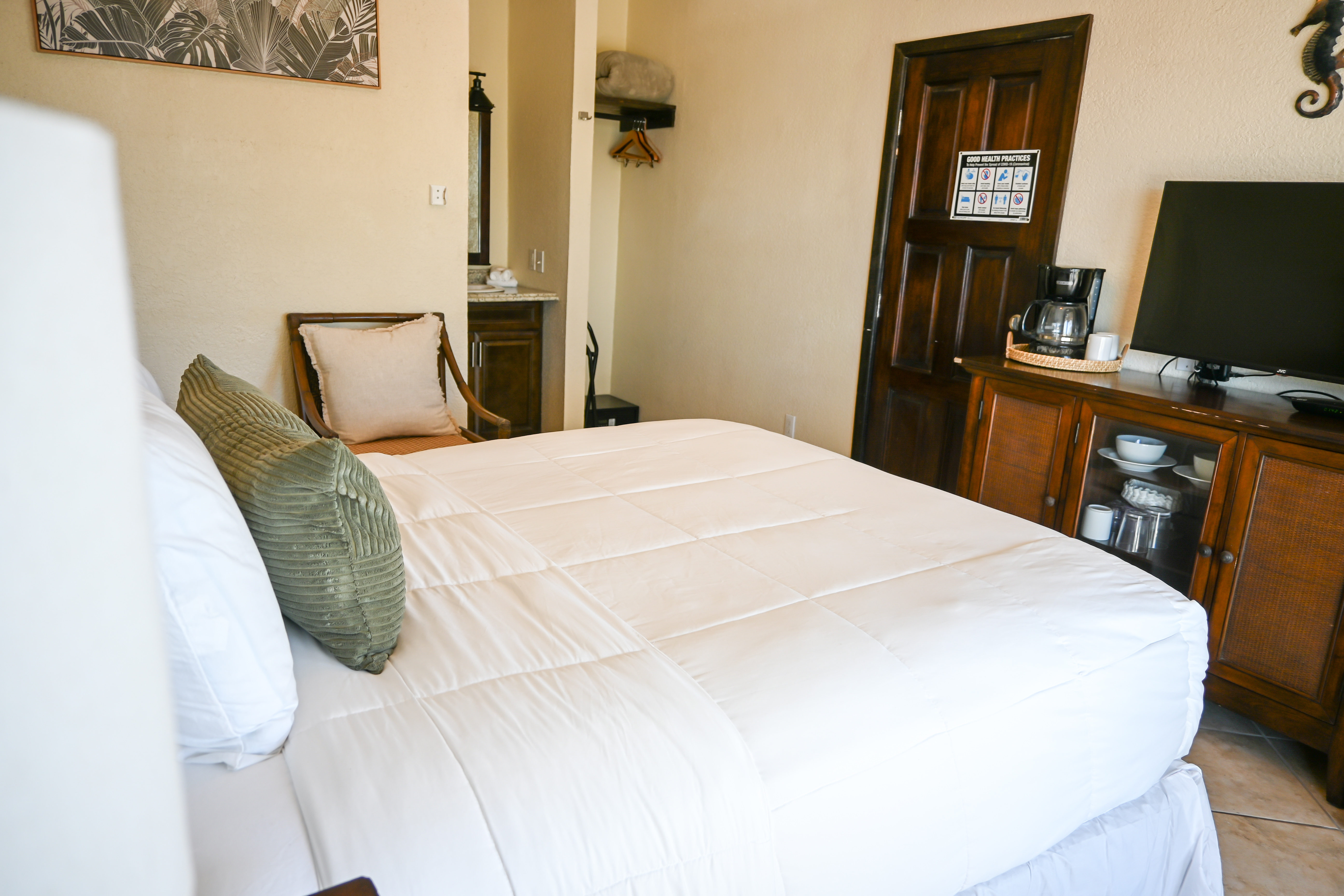 Ah! What better way to relax than looking at the ocean from your balcony suite! Our upper floor, one bedroom queen suites are the perfect size for an extended getaway. Each suite features a spacious bedroom with a queen sized bed, a private bathroom, central air-conditioning, a 40″ smart TV with cable, a kitchenette with a mini-refrigerator, microwave, coffee maker, toaster, blender, dishes and a unique coffee table that converts to a dining table.